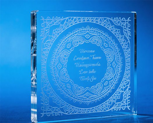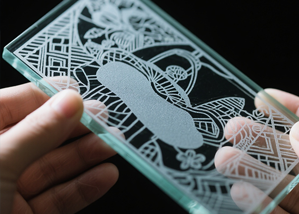 يمتص السطح الزجاجي ليزر ثاني أكسيد الكربون بشكل جيد ويستخدم بشكل شائع في نقش السطح. يظهر تأثير النقش بليزر ثاني أكسيد الكربون على شكل نمط أبيض بلوري، مما يجعله مناسبًا للإعلانات والديكور الفني وكتابة الهدايا. من ناحية أخرى، تتميز أشعة الليزر فوق البنفسجية بطول موجي أقصر وتعمل في وضع "المعالجة الباردة" مع الحد الأدنى من المنطقة المتأثرة بالحرارة. أشعة الليزر فوق البنفسجية قادرة على إنتاج الخطوط الدقيقة ورموز الاستجابة السريعة والشعارات.